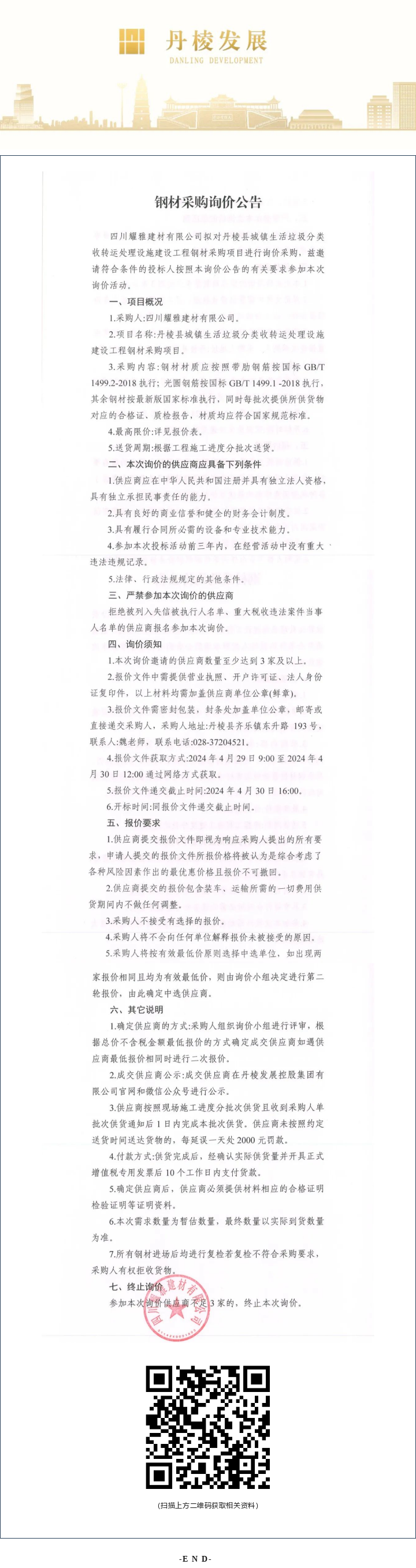 丹棱縣城鎮(zhèn)生活垃圾分類(lèi)收轉(zhuǎn)運(yùn)處理設(shè)施建設(shè)工程鋼材采購(gòu)項(xiàng)目詢(xún)價(jià)公告