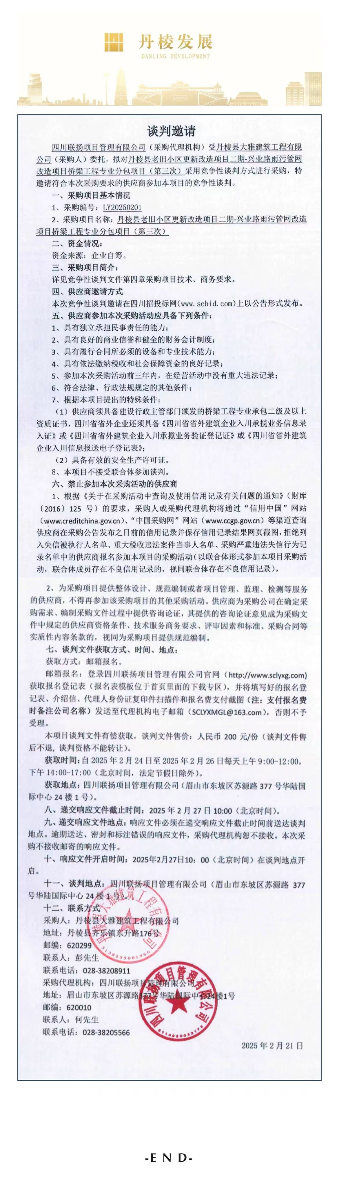 丹棱縣老舊小區(qū)更新改造項目二期-興業(yè)路雨污管網(wǎng)改造項目橋梁工程專業(yè)分包項目談判邀請公告(第三次)