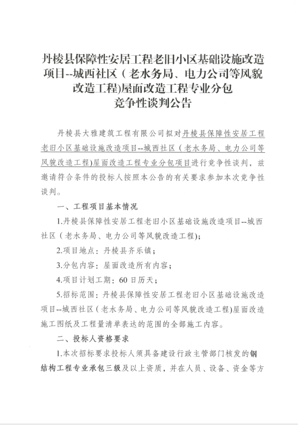 【大雅建筑公司】丹棱縣保障性安居工程老舊小區(qū)基礎(chǔ)設(shè)施改造項目--城西社區(qū)(老水務(wù)局、電力公司等風(fēng)貌改造工程)屋面改造工程專業(yè)分包競爭性談判公告