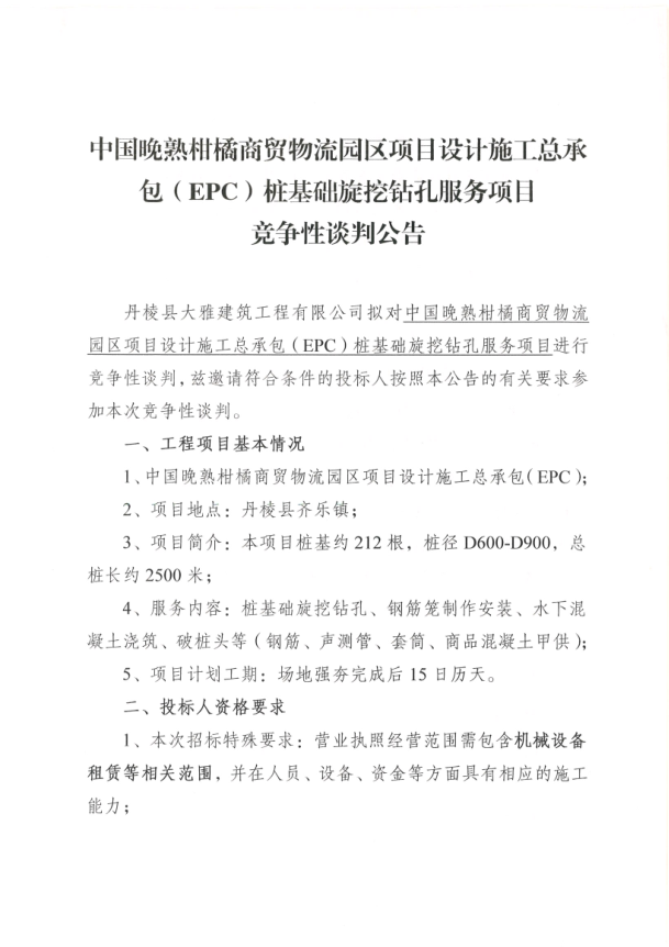 【大雅建筑公司】中國晚熟柑橘商貿(mào)物流園區(qū)項目設(shè)計施工總承包(EPC)樁基礎(chǔ)旋挖鉆孔服務(wù)項目競爭性談判公告