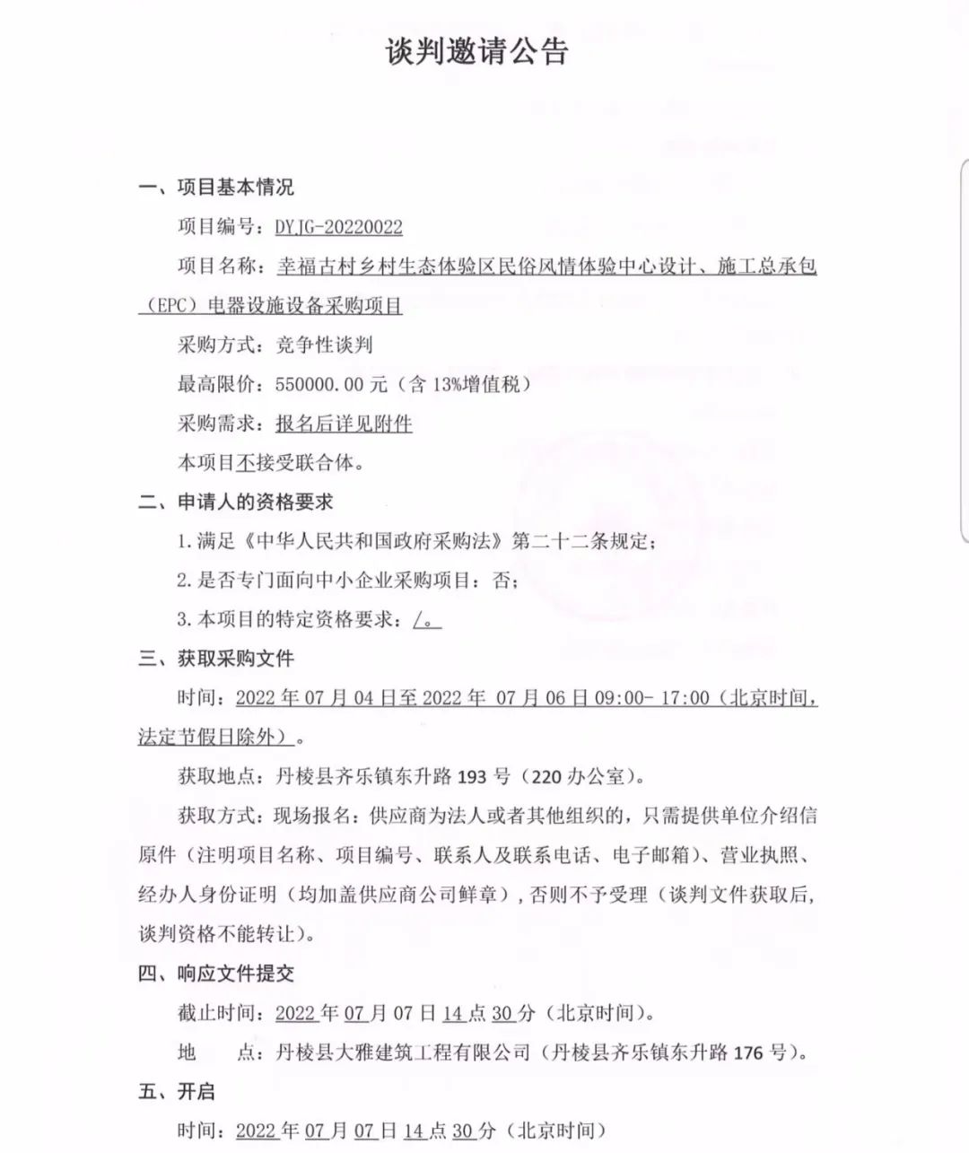 幸福古村鄉(xiāng)村生態(tài)體驗(yàn)區(qū)民俗風(fēng)情體驗(yàn)中心設(shè)計(jì)、施工總承包(EPC)電器設(shè)施設(shè)備采購(gòu)項(xiàng)目談判邀請(qǐng)公告