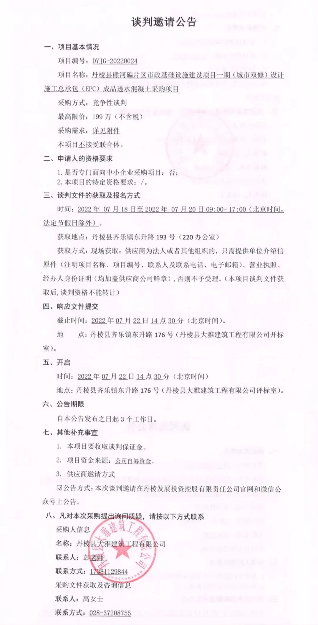 丹棱縣熊河碥片區(qū)市政基礎設施建設項目一期(城市雙修)設計施工總承包(EPC)成品透水混凝土采購項目談判邀請公告