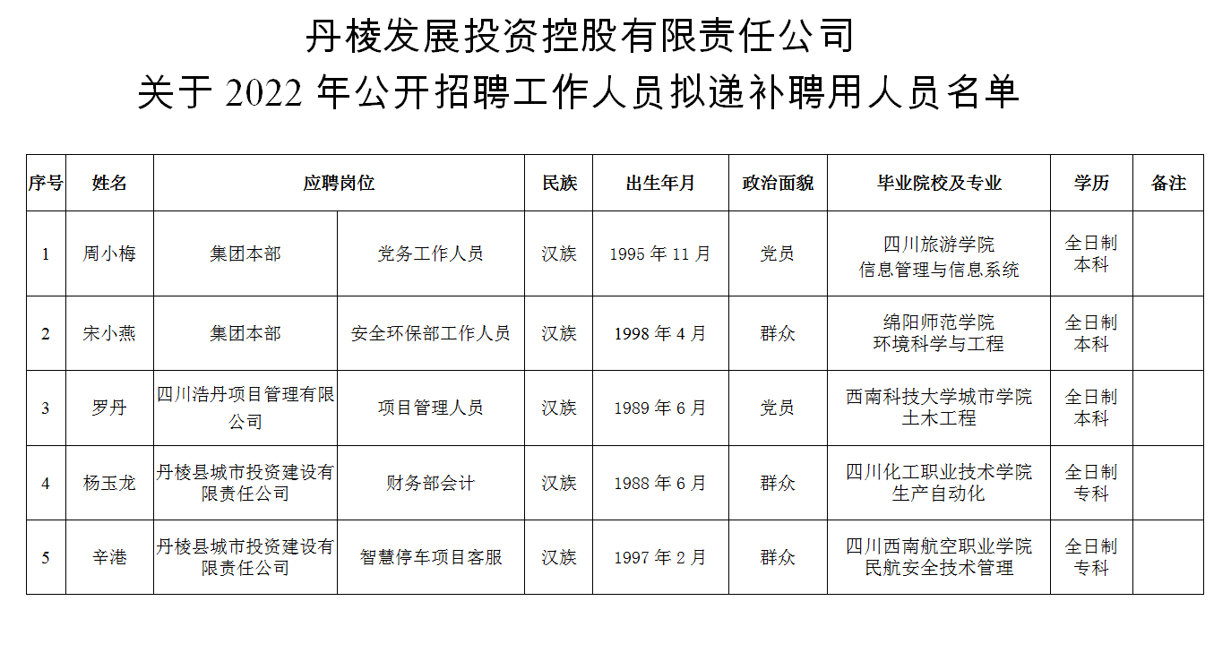 附件:丹棱發(fā)展投資控股有限責任公司關(guān)于2022年公開招聘工作人員擬遞補聘用人員名單