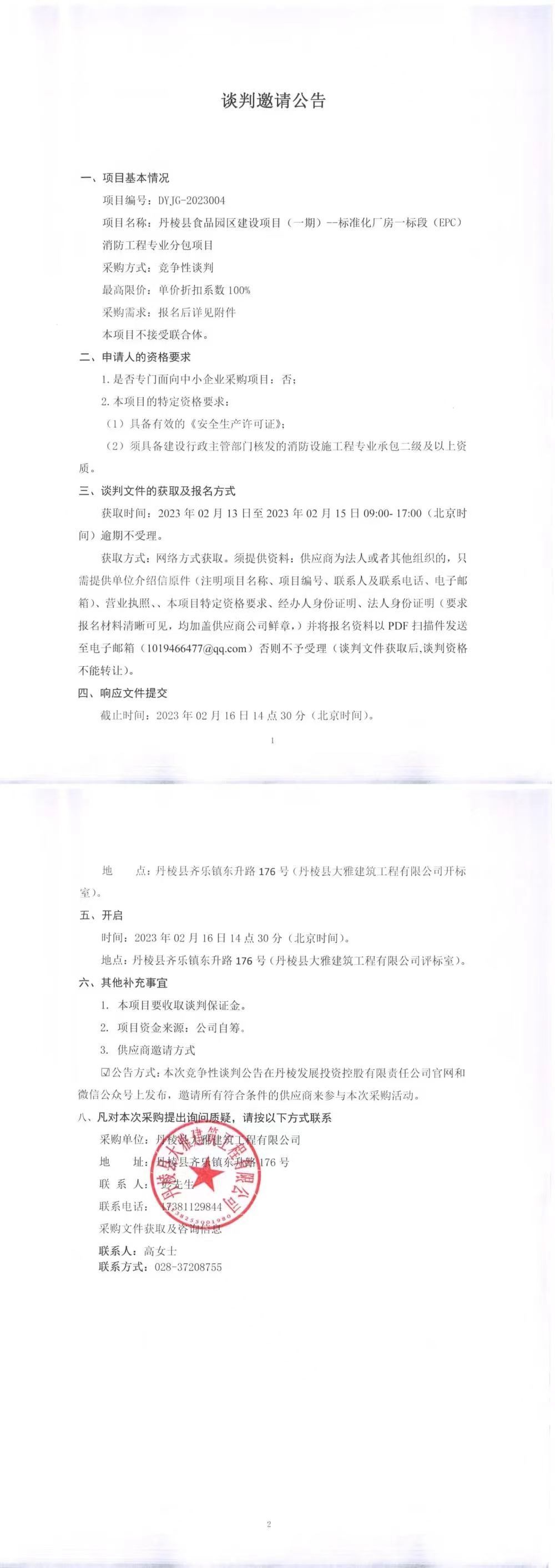 丹棱縣食品園區(qū)建設(shè)項(xiàng)目(一期)標(biāo)準(zhǔn)化廠房一標(biāo)段(EPC)消防工程專業(yè)分包項(xiàng)目談判邀請(qǐng)公告
