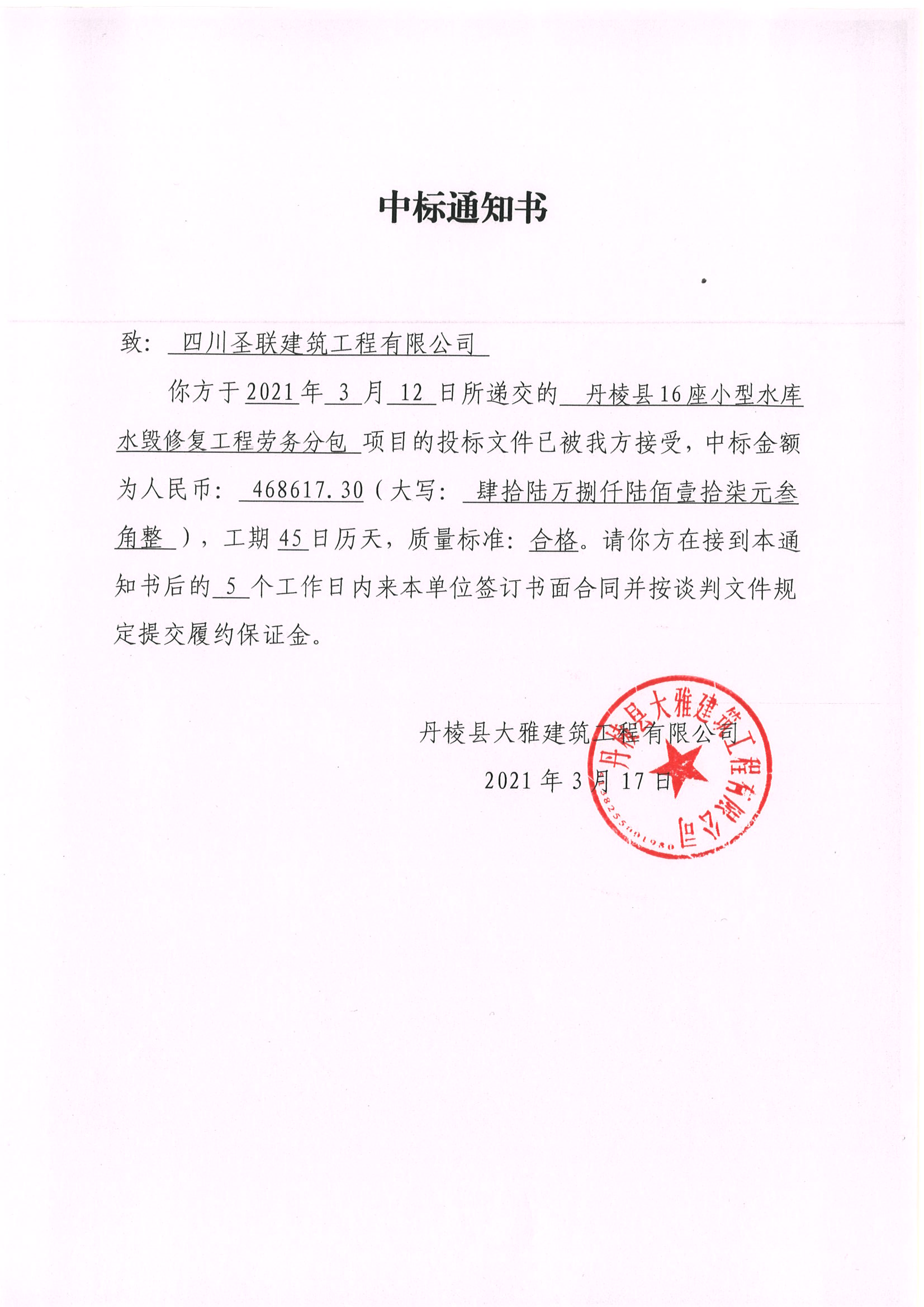 【大雅建筑公司】丹棱縣16座小型水庫水毀修復(fù)工程勞務(wù)分包中標成交公告