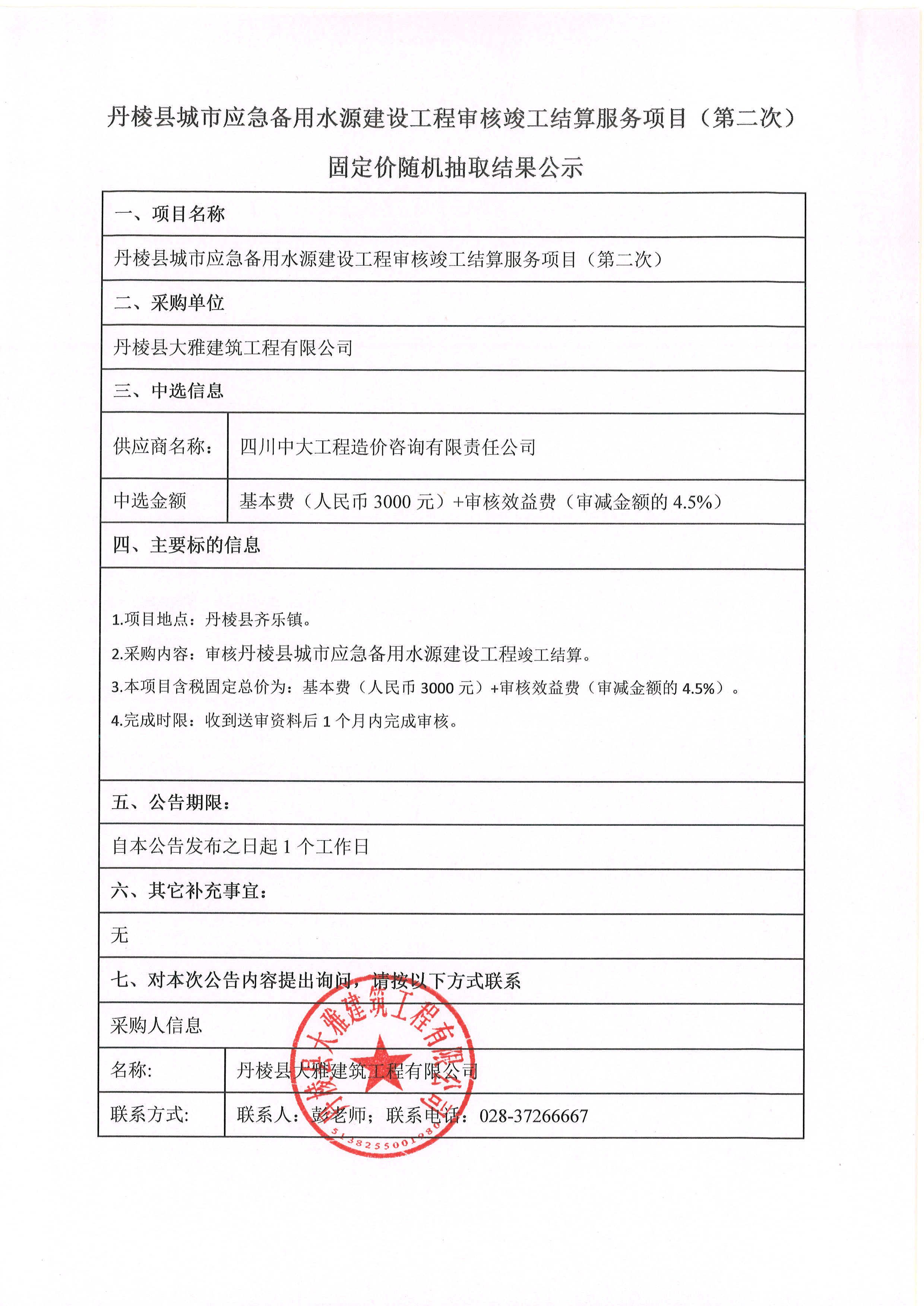 丹棱縣城市應(yīng)急備用水源建設(shè)工程審核竣工結(jié)算服務(wù)項(xiàng)目(第二次) 固定價隨機(jī)抽取結(jié)果公示