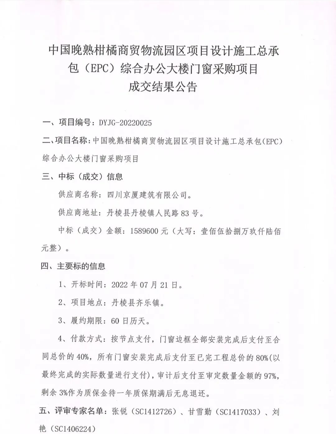 中國(guó)晚熟柑橘商貿(mào)物流園區(qū)項(xiàng)目設(shè)計(jì)施工總承包(EPC)綜合辦公大樓門(mén)窗采購(gòu)項(xiàng)目成交結(jié)果公告