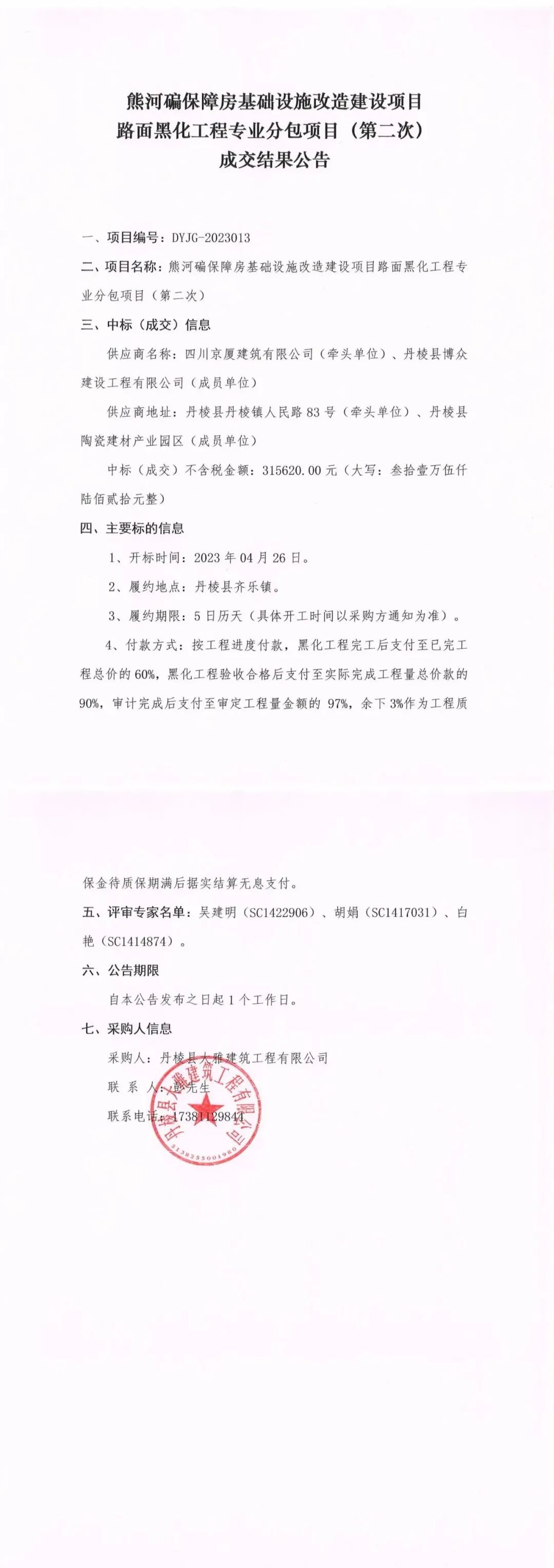 熊河碥保障房基礎(chǔ)設(shè)施改造建設(shè)項(xiàng)目路面黑化工程專業(yè)分包項(xiàng)目 (第二次)成交結(jié)果公告
