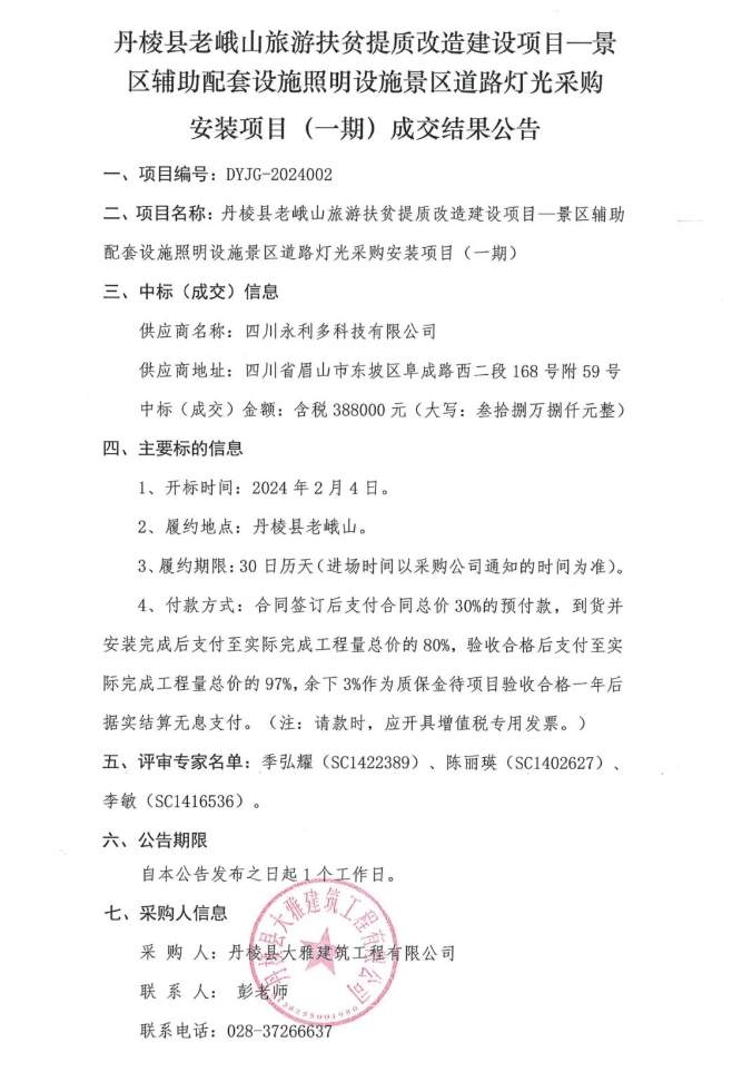 丹棱縣老峨山旅游扶貧提質(zhì)改造建設(shè)項(xiàng)目—景區(qū)輔助配套設(shè)施照明設(shè)施景區(qū)道路燈光采購(gòu)安裝項(xiàng)目(一期)成交結(jié)果公告