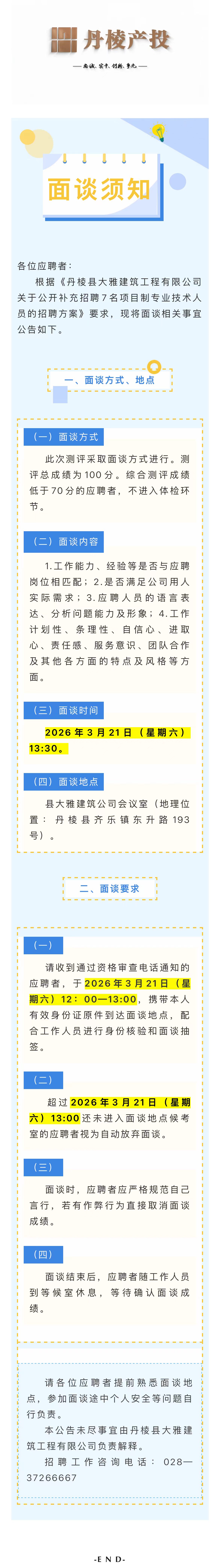 丹棱縣大雅建筑工程有限公司關(guān)于公開補(bǔ)充招聘7名項(xiàng)目制專業(yè)技術(shù)人員的面談須知