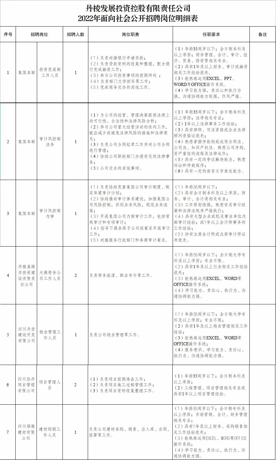 招聘崗位的學(xué)歷、專業(yè)、資歷、年齡等資格條件詳見附件《丹棱發(fā)展投資控股有限責(zé)任公司2022年面向社會公開招聘崗位明細表》。